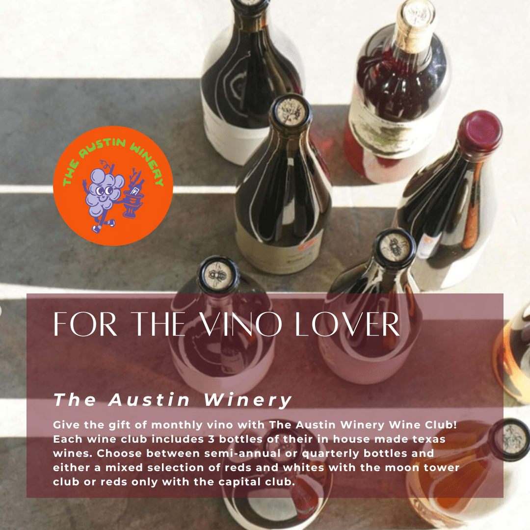 Give the gift of monthly vino with The Austin Winery Wine Club! Each wine club includes 3 bottles of their in-house made Texas wines. Choose between semi-annual or quarterly bottles and either a mixed selection of reds and whites with the Moon Tower Club or reds only with the Capital Club.